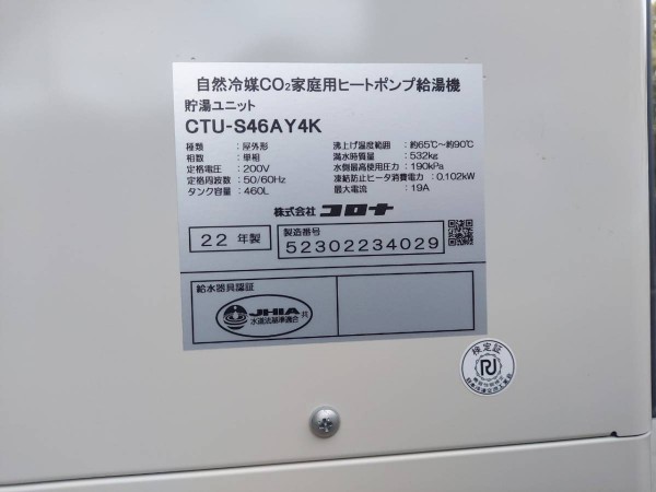 香美市 コロナ自然冷媒CO2家庭用ヒートポンプ給湯機 貯湯ユニットCTU-S46AY4K エコキュート交換工事
