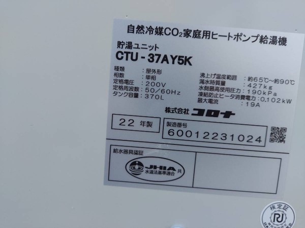 須崎市 コロナ自然冷媒CO2家庭用ヒートポンプ給湯機 貯湯ユニットCTU-37AY5K エコキュート交換工事