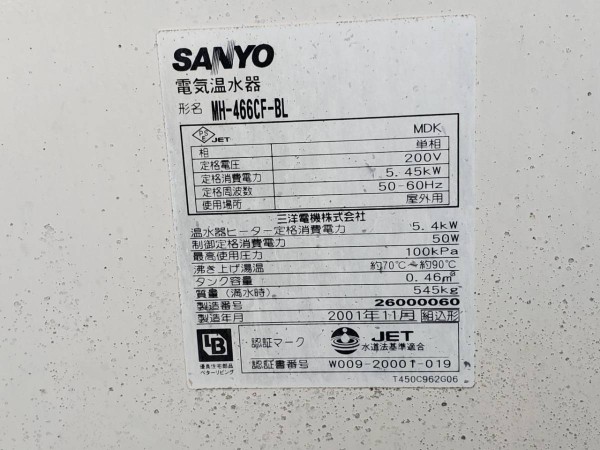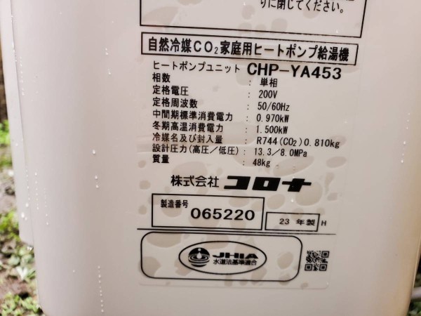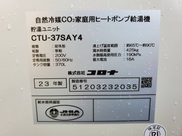 大豊町 コロナ自然冷媒CO2家庭用ヒートポンプ給湯機 貯湯ユニットCTU-37SAY4、ヒートポンプユニットCHP-YA453 エコキュート交換工事