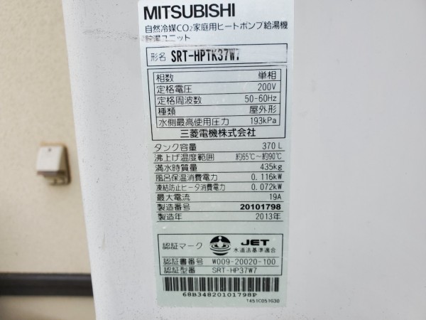 大月町 三菱電機エコキュートSRT-HPTK37WT→コロナ自然冷媒CO2家庭用ヒートポンプ給湯機貯湯ユニットCTU-37AY5K エコキュート交換工事