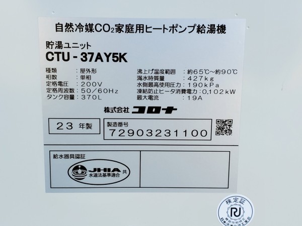 大月町 コロナ自然冷媒CO2家庭用ヒートポンプ給湯機貯湯ユニットCTU-37AY5K エコキュート交換工事