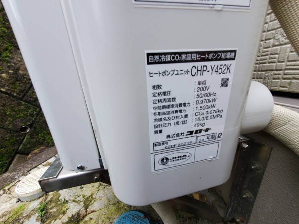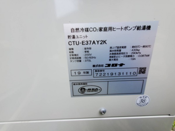 越知町自然冷媒CO2家庭用ヒートポンプ給湯機貯湯ユニットCTU-E37AY2K、ヒートポンプユニットCHP-Y452K