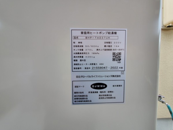 大川村 日立家庭用ヒートポンプ給湯機BHP-TAD37UK エコキュート交換工事