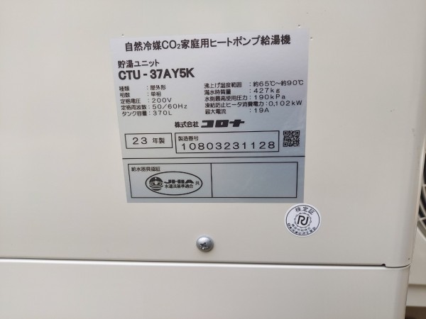 安芸市 コロナ自然冷媒CO2家庭用ヒートポンプ給湯機貯湯ユニットCTU-37AY5K エコキュート交換工事