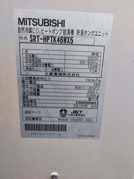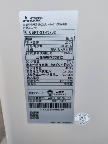 高知市 三菱電機エコキュートSRT-HPTK46WX5→三菱電機家庭用自然冷媒CO2ヒートポンプ給湯機貯湯ユニットSRT-STK376D エコキュート交換工事