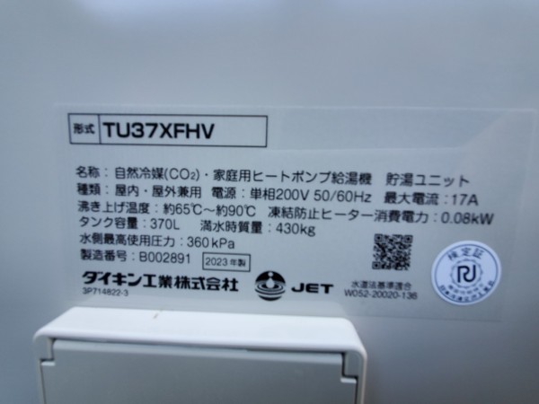 黒潮町 ダイキン自然冷媒(CO2)・家庭用ヒートポンプ給湯機貯湯ユニットTU37XFHV エコキュート交換工事