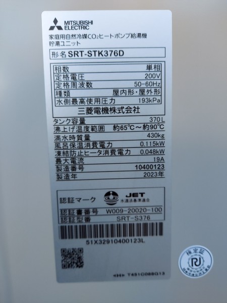 北川村 三菱電機家庭用自然冷媒CO2ヒートポンプ給湯機貯湯ユニットSRT-STK376D エコキュート交換工事