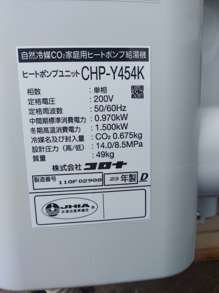 大月町 コロナ自然冷媒CO2家庭用ヒートポンプ給湯機ヒートポンプユニットCHP-Y454K エコキュート交換工事