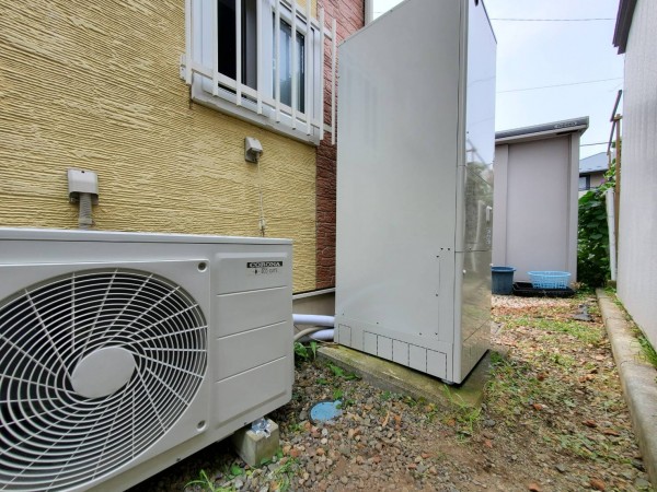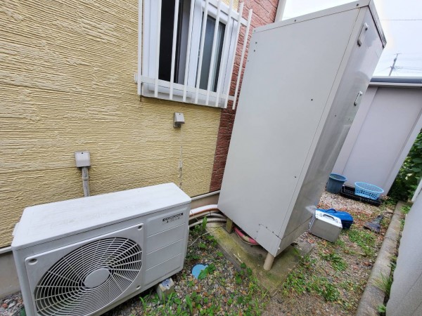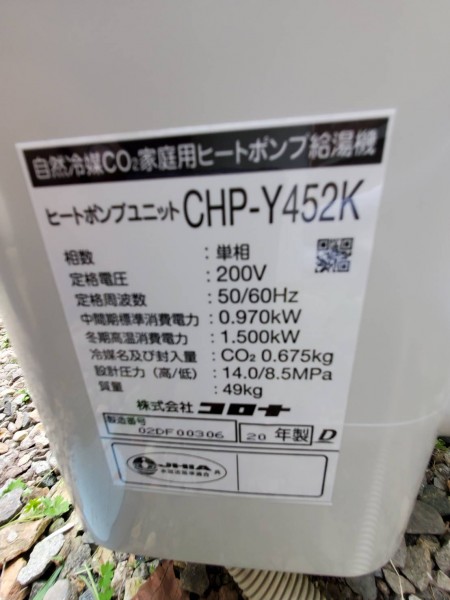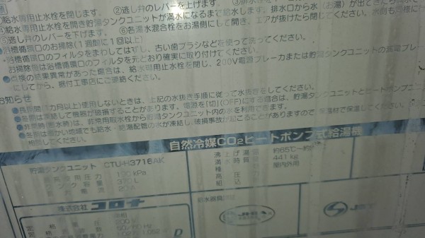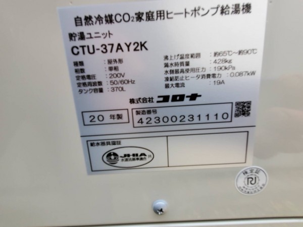 安芸市コロナ自然冷媒CO2家庭用ヒートポンプ給湯器貯湯ユニットCTU-37AY2K、ヒートポンプユニットCHP-Y452K