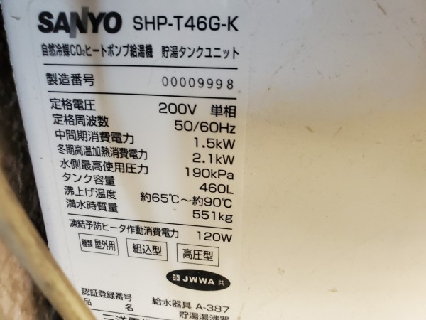 いの町 SANYOエコキュート→コロナ自然冷媒CO2家庭用ヒートポンプ給湯機ヒートポンプユニットCHP-Y454K エコキュート交換工事