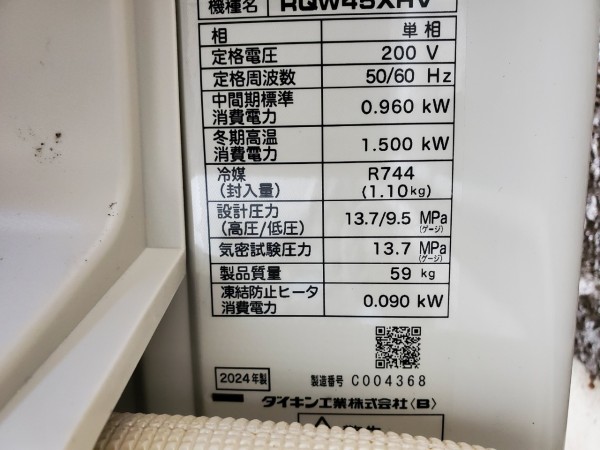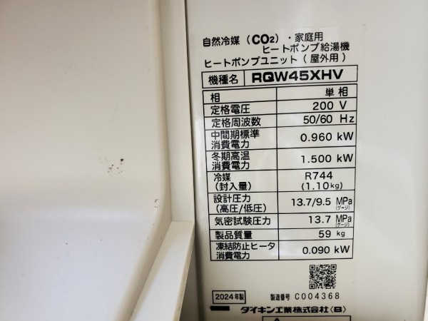 芸西村 ダイキン自然冷媒(CO2)・家庭用ヒートポンプ給湯機ヒートポンプユニットRQW45XHV エコキュート交換工事