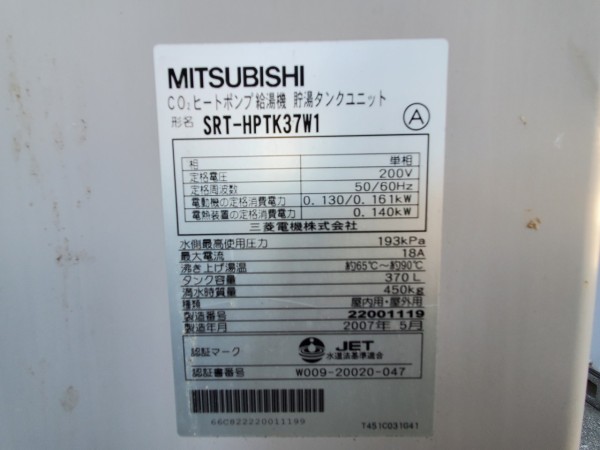 越知町 三菱電機エコキュート→三菱電機自然冷媒CO2家庭用ヒートポンプ給湯機貯湯ユニットSRT-STK376D エコキュート交換工事