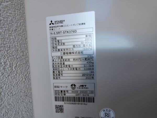 越知町 三菱電機自然冷媒CO2家庭用ヒートポンプ給湯機貯湯ユニットSRT-STK376D エコキュート交換工事