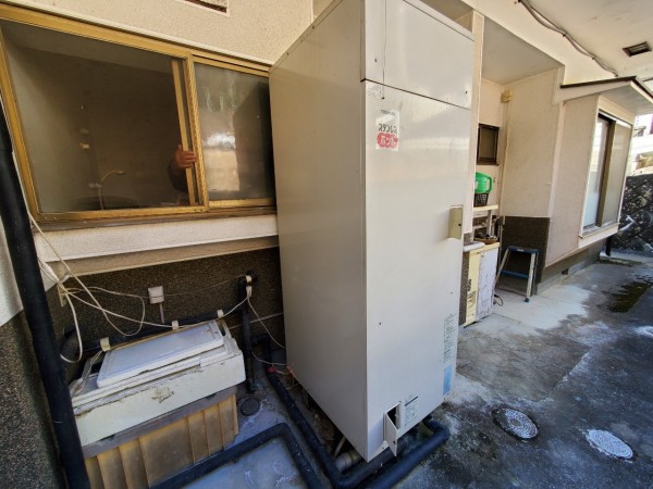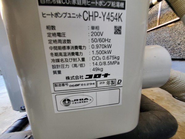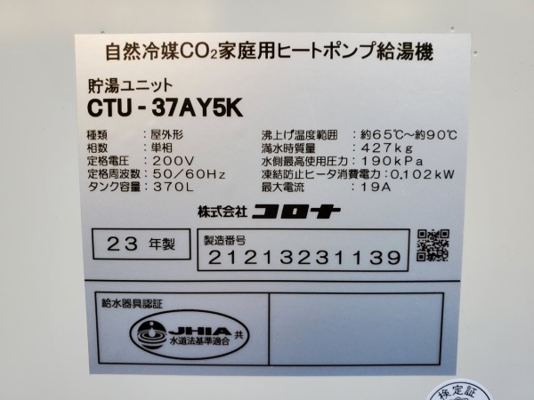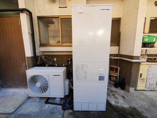 大豊町 コロナ自然冷媒CO2家庭用ヒートポンプ給湯機ヒートポンプユニットCHP-Y454K、貯湯ユニットCTU-37AY5K エコキュート交換工事