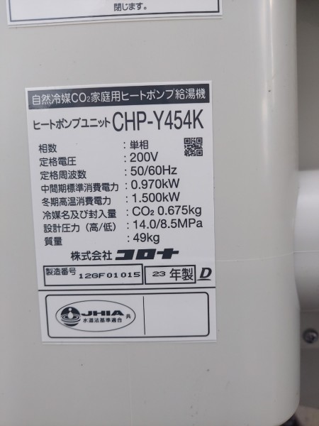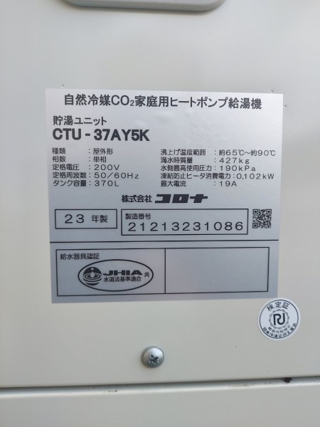 大川村 コロナ自然冷媒CO2家庭用ヒートポンプ給湯機ヒートポンプユニットCHP-Y454K、貯湯ユニットCTU-37AY5K エコキュート交換工事