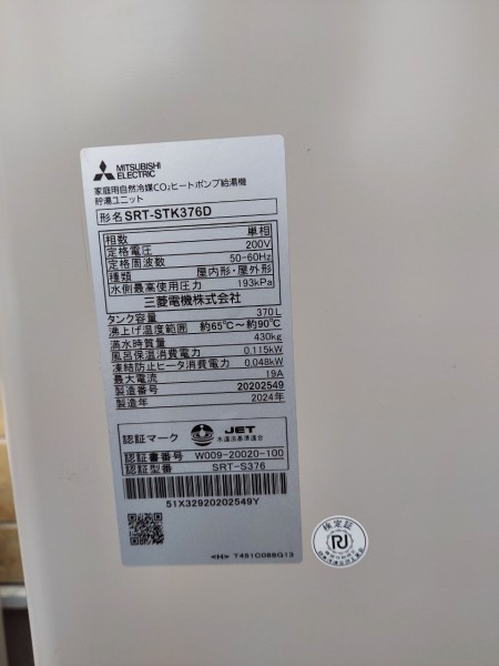 宿毛市 三菱電機自然冷媒CO2家庭用ヒートポンプ給湯機貯湯ユニットSRT-STK376D、ヒートポンプユニット エコキュート交換工事