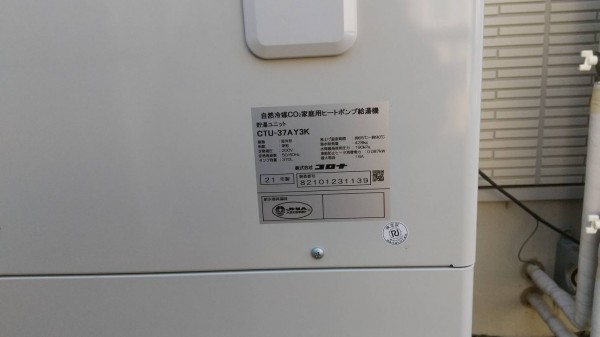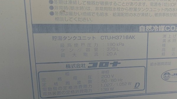 越知町コロナ自然冷媒CO2家庭用ヒートポンプ給湯機貯湯ユニットTU-37AY3K
