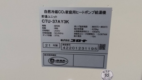 高知市コロナ自然冷媒CO2家庭用ヒートポンプ給湯機貯湯ユニットCTU-37AY3K