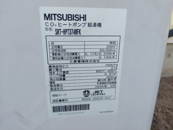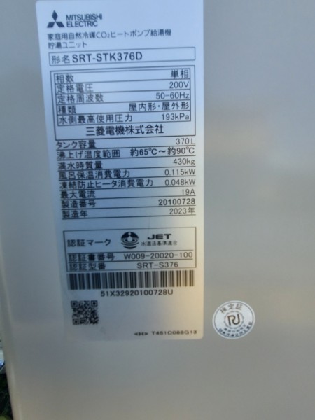 高松市 三菱電機自然冷媒CO2家庭用ヒートポンプ給湯機 貯湯ユニットSRT-STK376D エコキュート交換工事