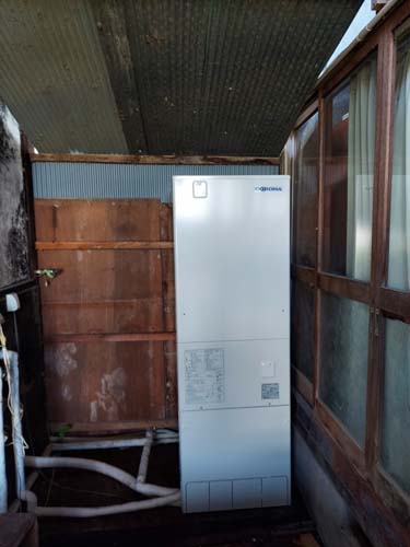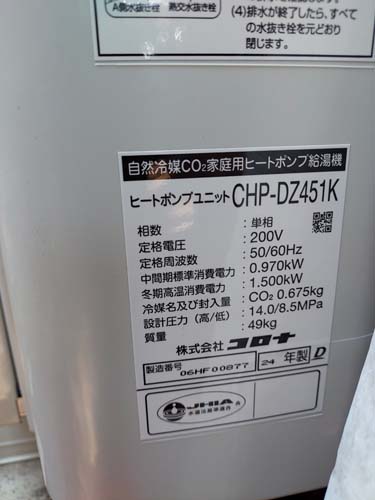 さぬき市 三菱電機エコキュート→コロナ自然冷媒CO2家庭用ヒートポンプ給湯機 貯湯ユニットCTU-37AZ1K、ヒートポンプユニットCHP-DZ451K エコキュート交換工事