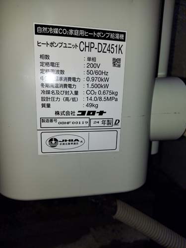 坂出市 コロナエコキュート→コロナ自然冷媒CO2家庭用ヒートポンプ給湯機 ヒートポンプユニットCHP-DZ451K エコキュート交換工事