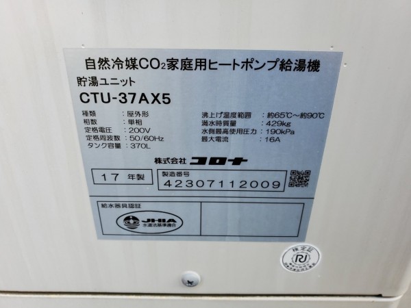 安芸市コロナ自然冷媒CO2家庭用ヒートポンプ給湯機貯湯ユニットCTU-37AX5、太陽光発電機