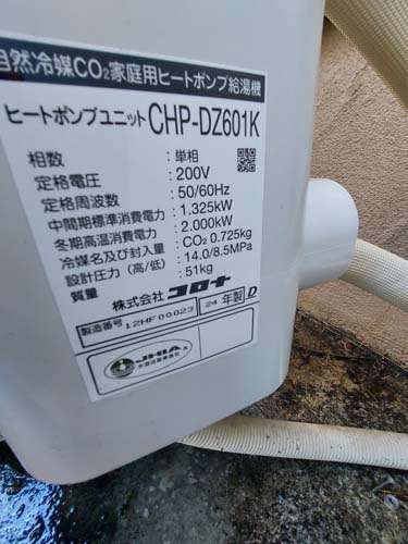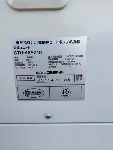 三木町 コロナ自然冷媒CO2家庭用ヒートポンプ給湯機ヒートポンプユニットCHP-DZ601K、貯湯ユニットCTU-46AZ1K エコキュート交換工事