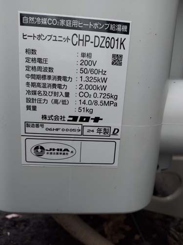 まんのう町 コロナ自然冷媒CO2家庭用ヒートポンプ給湯機ヒートポンプユニットCHP-DZ601K エコキュート交換工事