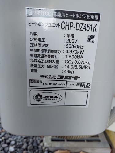宇多津町 コロナ自然冷媒CO2家庭用ヒートポンプ給湯機 ヒートポンプユニットCHP-DZ451K エコキュート交換工事