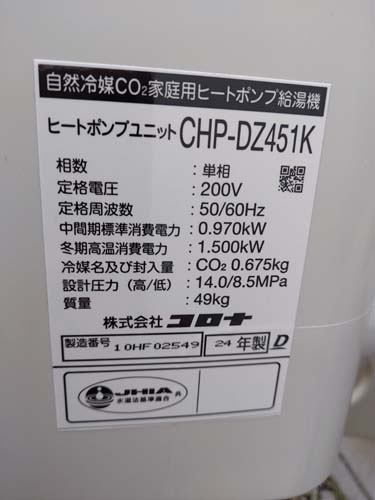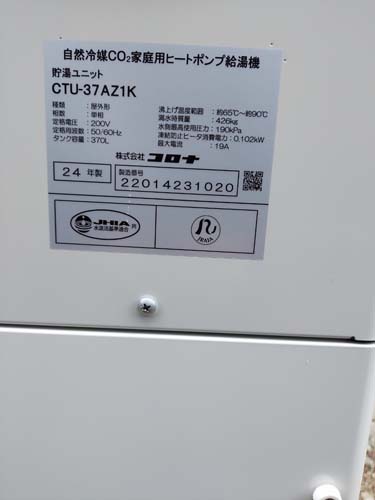 観音寺市 コロナ自然冷媒CO2家庭用ヒートポンプ給湯機貯湯ユニットCTU-37AZ1K、ヒートポンプユニットCHP-DZ451K エコキュート交換工事
