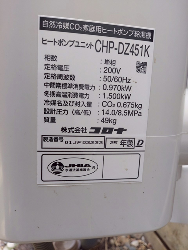 観音寺市昭和町 コロナ自然冷媒CO2家庭用ヒートポンプ給湯機 ヒートポンプユニットCHP-DZ451K エコキュート交換工事