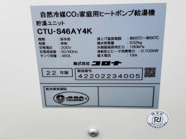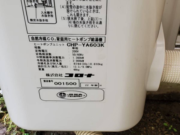 馬路村 コロナ自然冷媒CO2家庭用ヒートポンプ給湯機ヒートポンプユニットCHP-YA603K・貯湯ユニットCTU-S46AY4K エコキュート交換工事